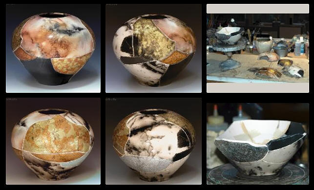 | My re-built or restored pots are grounded in the Japanese art of Kintsugi, where pots are fixed with gold dusted glue. The Japanese have come to cherish the imperfection of a broken pot fixed this way, seeing it as a creative addition and or re-birth to the pot’s life story. When creatively done, it contributes to the pots life and history, making it more beautiful and precious. |
