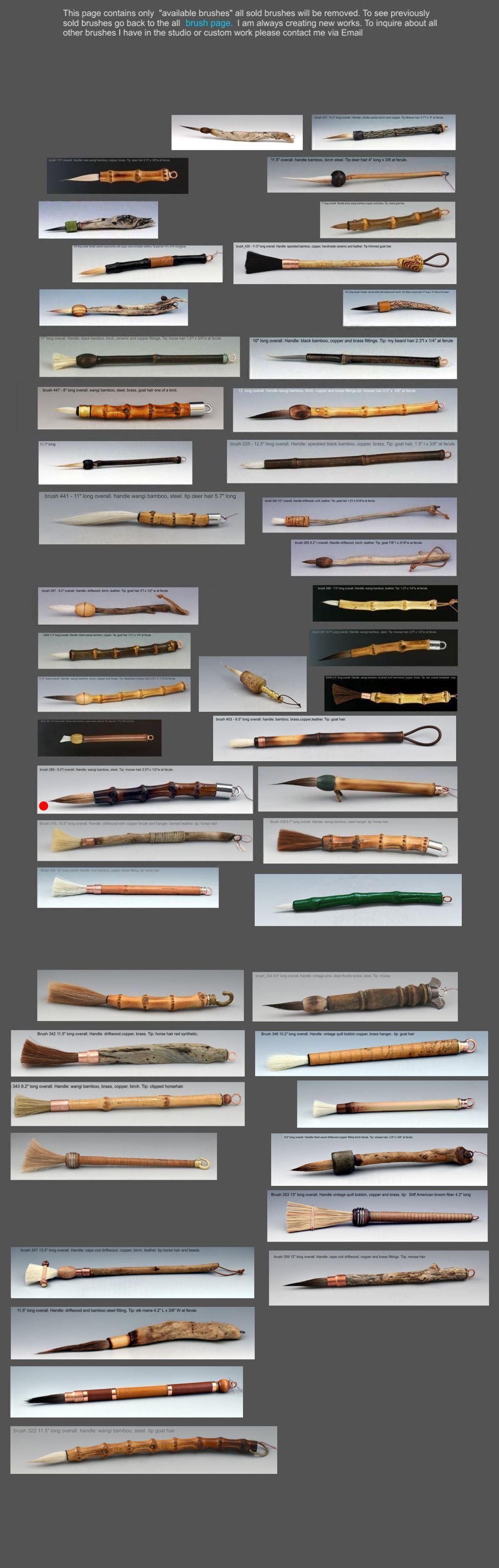 Some of my brushes lean more to sculpture but, all are FUNCTIONAL.. My brushes, for the most part, designed for water base media. They will perform differently depending on the consistency of the media used. They are suitable for most ceramic slips, glazes and under glazes, ink, water color or acrylics. The test examples on the following pages are done with water based media and ceramic glazes on paper. Test images are often repeated for very similar tips.. Click here for Brush usage and cleaning information Click here for information on my brushes and the methods I use to create them.