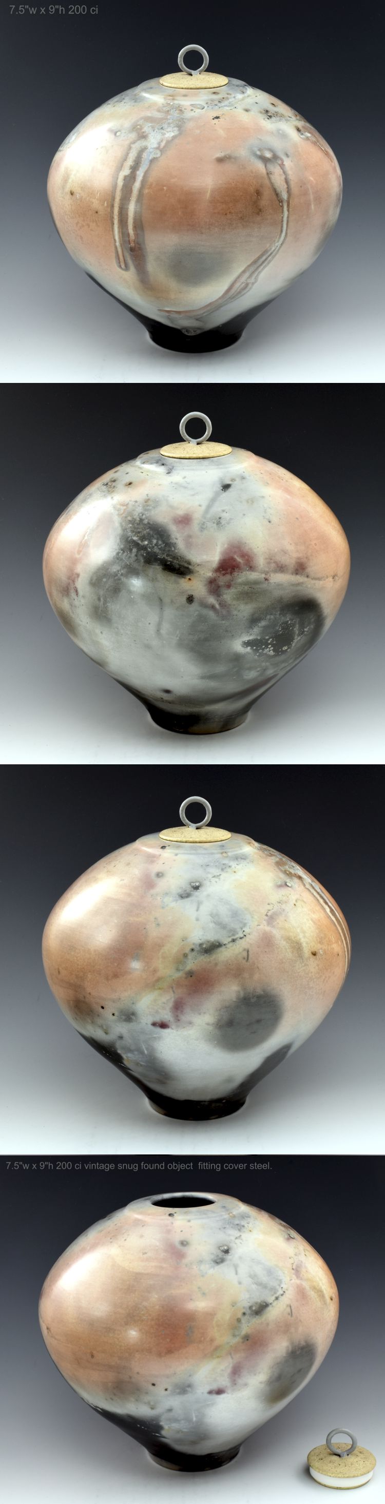 Burnished, Sagger fired Porcelain Vessel with vintage found object snug fitting cover.