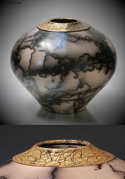 SOLD Horse Hair 113 This piece was burnished and Raku fired with horse hair application. After a cleaning and addition of a crackled gold leaf, the piece was waxed. You may contact me via Email for other pictures of this unique series of vessels. 6.5"h x 7"w