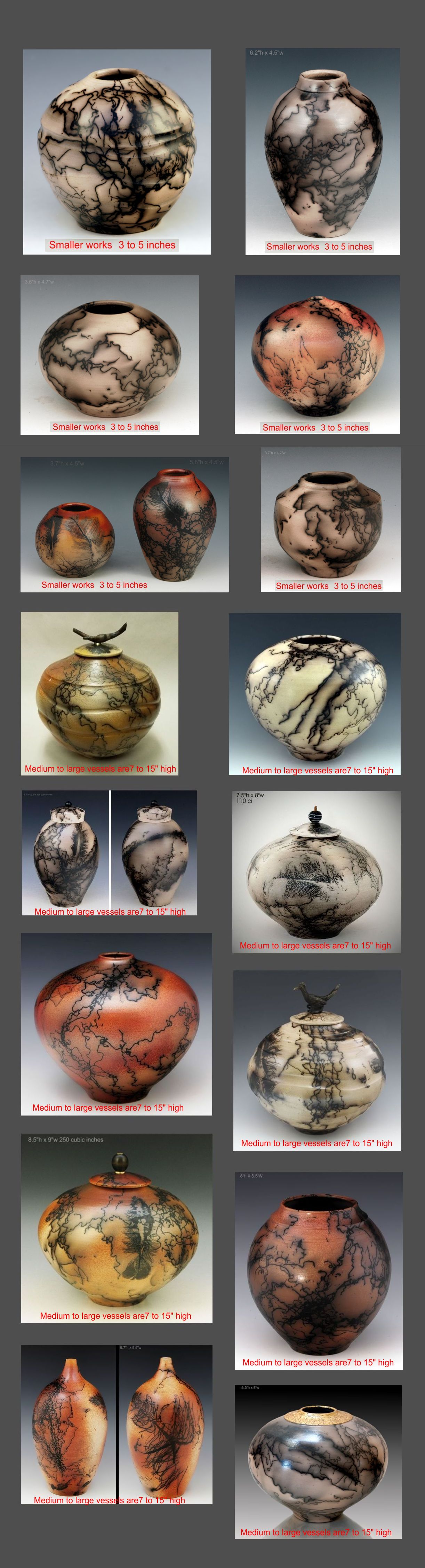 These images are examples of previously completed and sold works - Some are fired with only horse hair and other with horse hair and feathers. Some have been sprayed with a Ferric Chloride solution during firing for a varied red color - Scroll down please