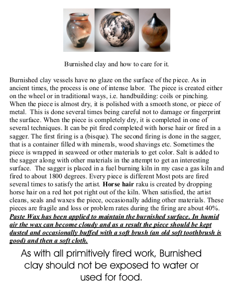 Information about caring for Burnished horsehair/sagger work - single Sheet