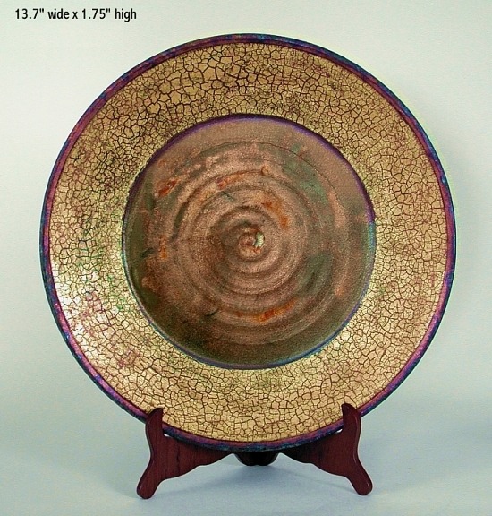 This flawless plate has a copper matte finish and gold leaf with crackle on the rim.