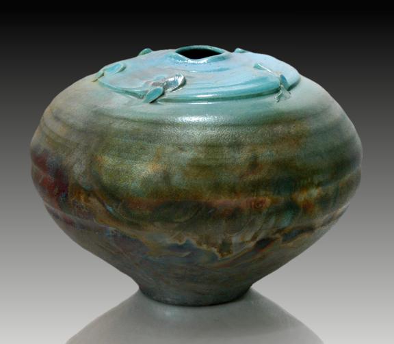 Wheel thrown and altered vessel with multiple Raku glazes See the image below for another view of this piece.