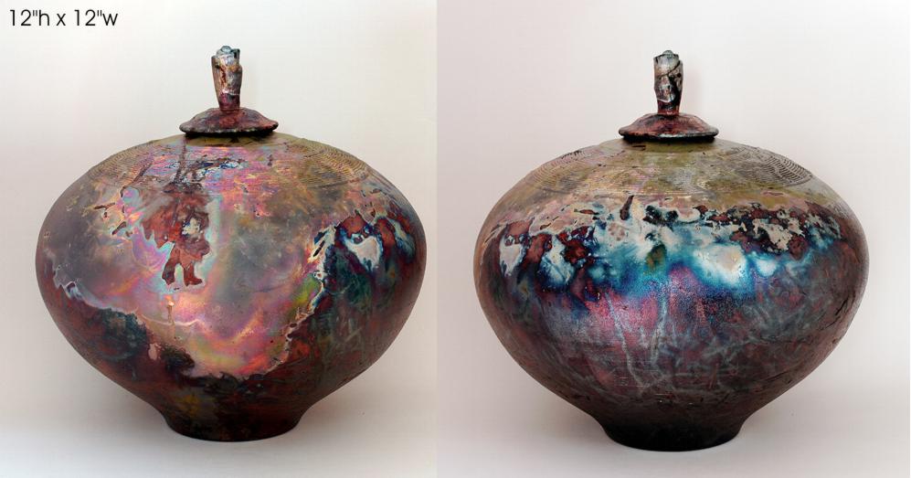 Wheel thrown oval covered vessel with copper patina glaze with slip and scrafitto decoration at the shoulder.