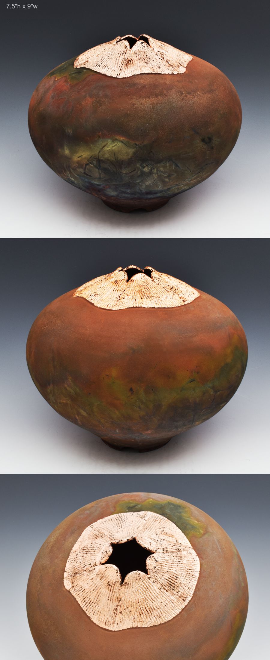 SOLD ARTFINDER Matte 661 Wheel thrown, altered and carved Stoneware Vessel. Raku fired with a copper bearing glaze and copper leaf addition. cut foot ring. 7.5"h x 9"w $495.00 I have tried to be extremely careful with the color of my images but, please be aware that all computer monitors and cell phone screens will show these works a bit differently.