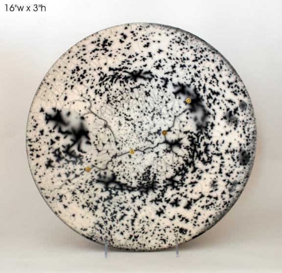 Wheel thrown and drilled for 4 brass rivets. 16" diameter.
