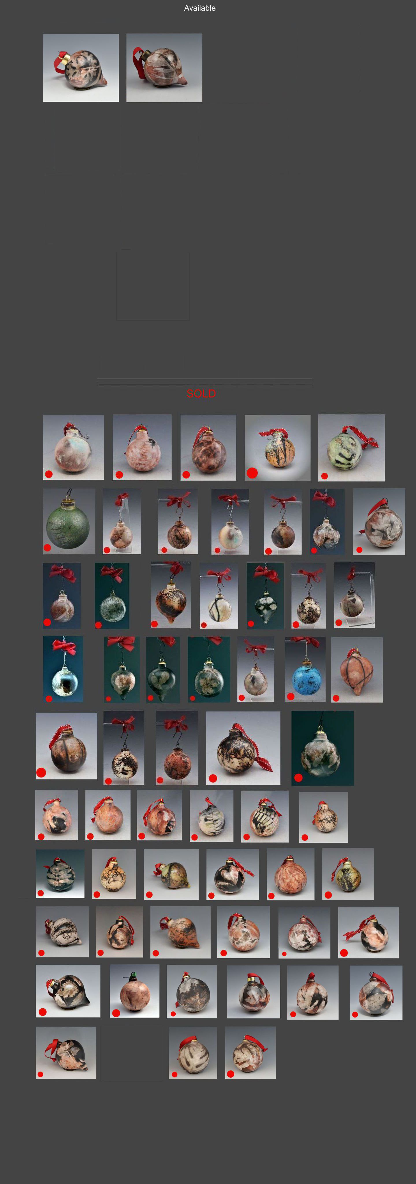 A series of unique hand made one-of-a-kind Raku & Smoke fired ornaments. Click on thumbnails for larger images and pricing. I have many more ornaments in the studio, Please Inquire. Email CLICK HERE FOR CUSTOM HORSEHAIR ORNAMENTS Please Email me with questions or other photos.