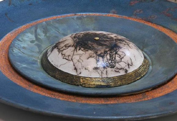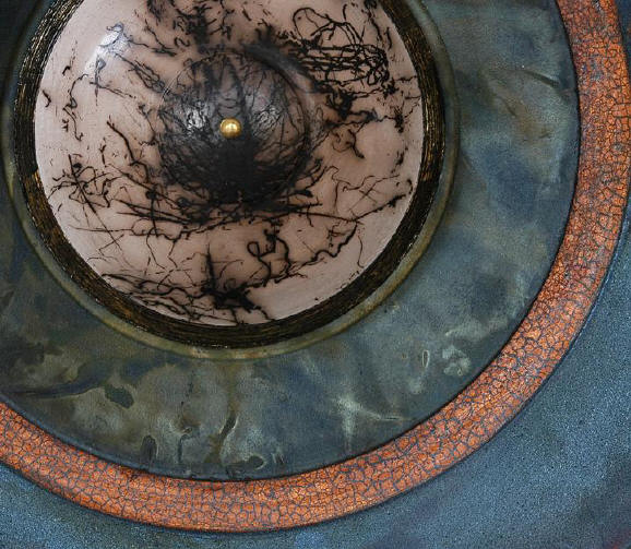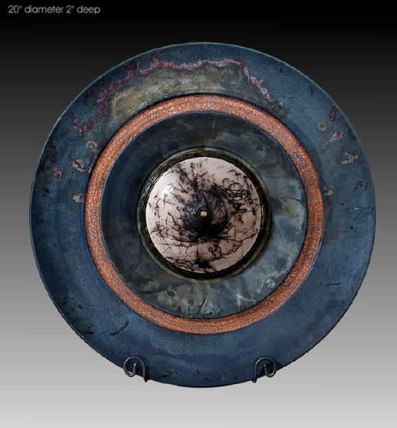 This piece is composed of several separately fired sections. Both the outer ring with copper leaf band and the inner ring are copper patina glazed. The dome is burnished horse hair with gold leaf and a brass insert. This large wall piece includes an iron mounting bracket. Scroll down for additional details.