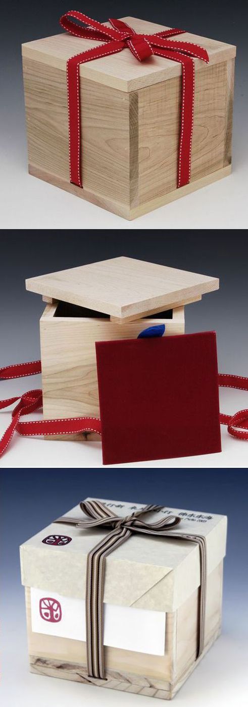 Tomobako 3 Only 2 left in stock here in the studio. Hand built from 1/2" - maple, 6.5" square exterior - 5.5" square interior. Includes red mat floor board, black or red grosgrain cord, plain or stitched depending on supply. and instructions for re-tying the Cho musubi bow. Folded signed paper dust covers are optional $4.00. These are suitable for bowls and small vessels as well other artwork and precious items. These were inspired by but not quite the same as the traditional Japanese Tomobako boxes used to store art. Information As with all wooden boxes of this type, a little warping of the lid may occur at certain times of the year. It is unavoidable because the lid traditionally is a single piece of wood with 2 rails to fit it. Changes in the moisture content of the room (Winter-Summer) will contribute to this. $90.00 plus shipping (usually USPS priority mail insured) Turn around time on these boxes depends on available materials. Orders could take several weeks to complete. |